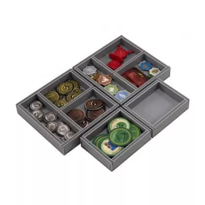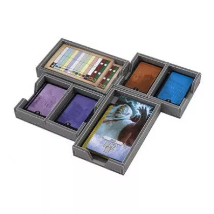 Insert compatible with 7 Wonders Duel® and the Pantheon® expansion. The design provides both efficient storage and improved game play. The trays can be utilised during the game, and they greatly aid set-up and clear-away times. The rules and boards act as a lid on top of the trays. There are two trays for storing the three age decks and the guild cards. The two larger trays are for the large cards and the score pads. the wonder and divinity cards are stored together. All cards can be sleeved. There is a tray for the coins, with separate slots for each value. The other large tray is for the pawns, the mythology and other tokens. There is a separate tray for the progress tokens, and one spare tray. The rules are placed on top of the insert trays acting as a lid. Next place the two game boards followed by the rule book from the Pantheon® expansion. This product consists of a flat-pack of 2 Evacore sheets. The trays require assembly, which is quick and fun, using ordinary PVA glue. Detailed instructions are included in the package.