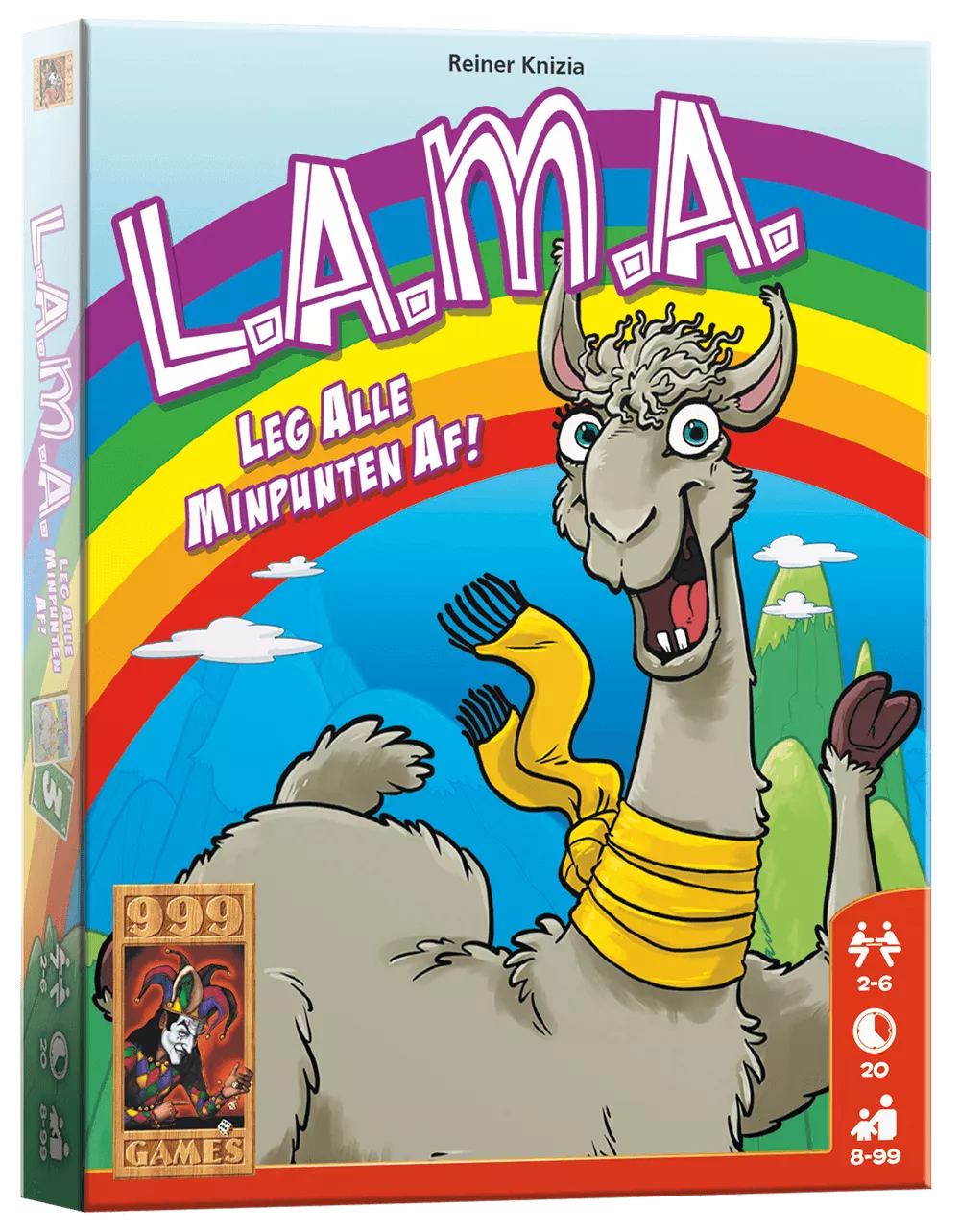 Vlot kaartspel Het motto van L.A.M.A. is: Leg Alle Minpunten Af. Elke beurt probeer je kaarten af te leggen, anders krijg je er minpunten voor. Kun je niets afleggen, dan beslis je om te passen of een (hopelijk goede) kaart te trekken. Je krijgt minpunten in de vorm van fiches. Lukt het je om al je kaarten kwijt te raken, dan mag je een fiche teruggeven. En dat mag er één van waarde 1 of van waarde 10 zijn. Aan het einde wint de speler met de minste minpunten! L.A.M.A. is een grappig en toegankelijk kaartspel met zeer eenvoudige spelregels!