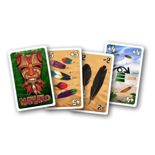Verenfeest Een kleurrijk kaartspel voor het hele gezin. Het is feest op het eiland! Bij dit feest worden 5 verschillende houten maskers versierd. Het mooist versierde masker zal geluk en fortuin brengen voor degene die het gemaakt heeft. Iedereen versiert samen alle maskers, en wil natuurlijk zijn eigen masker zo mooi mogelijk maken, maar je wilt voorkomen dat anderen doorhebben welk masker van jou is, zodat de mooiste veren uiteindelijk bij jouw masker belanden. De spelers spelen kaarten met gekleurde of zwarte veren door ze bij een van de vijf maskers te plaatsen. Ze weten niet van elkaar wie welk masker heeft, maar daar willen ze wel achter komen. Weten ze het goed te raden, dan krijgen ze daar bonuspunten voor en als iedereen een masker goed weet te raden, verliest de speler van wie dat masker was. Uiteindelijk wint de speler wiens masker de meeste punten waard is en waarvan de minste spelers hebben kunnen raden van wie het masker is. Versier de maskers op het eiland, maskeer jezelf en pak je geluk! Waarom wil je dit spelen? – Een tactisch spel. Hoe versier je je eigen masker zonder dat je verraadt welke van jou is? – Toegankelijk maar zeker niet simpel. Inclusief optionele regels voor jonge kinderen – Visueel kleurrijk en aantrekkelijk