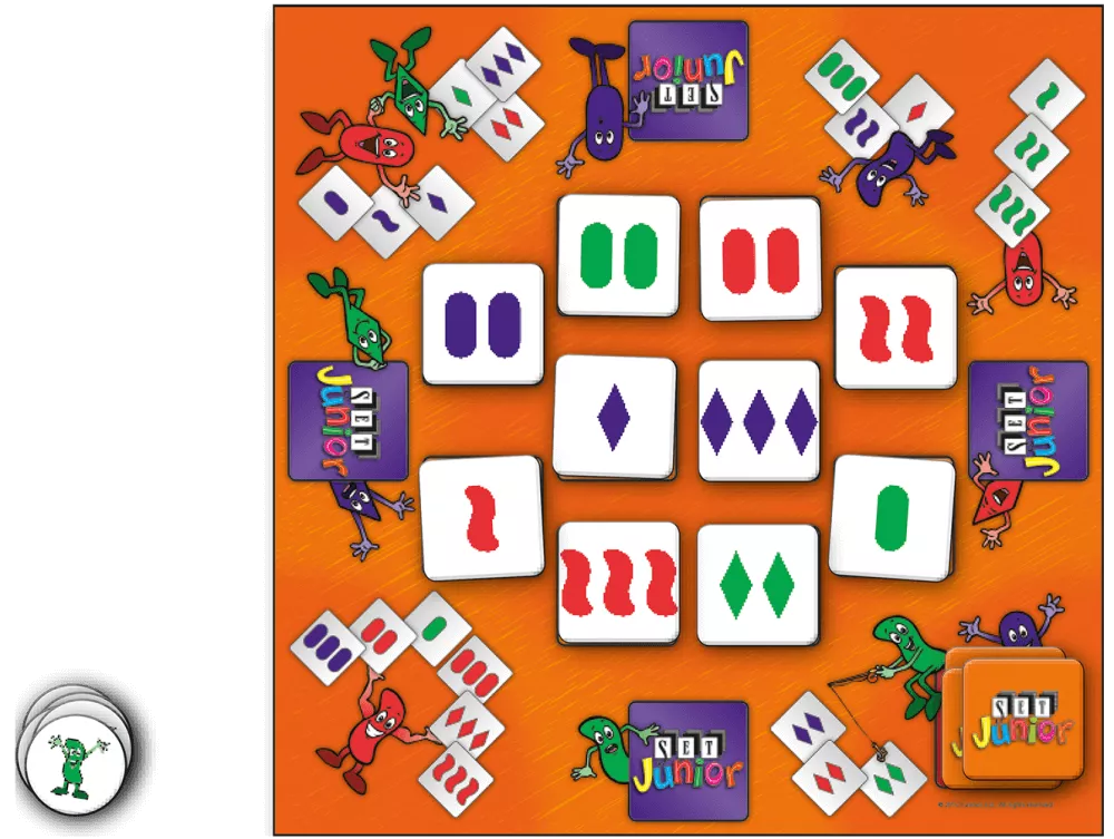 Vereenvoudigde versie van het populaire combineer- en reageerspel SET. Dit spel, dat al geschikt is voor kinderen vanaf 3 jaar, bevat twee versies. Aan de ene kant van het speelbord leggen kinderen tegels op overeenkomstige afbeeldingen en krijgen punten als ze op het speelbord afgebeelde SETs afbouwen. Op het andere speelbord kunnen kinderen het welbekende combineerspel spelen met maar 3 eigenschappen in plaats van 4.