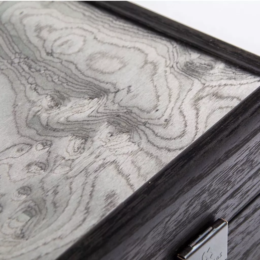 Vavona Burl veneer is sliced from huge, prolific burl growths found on occasional redwoods, producing some of the largest and most uniform burled veneer in the world. The grey coloring of the wood can be caused by natural weathering. Our innovative technique mimics the lengthy ageing process of wood to yield pearly grey. The playing field is a combination of black Oak with light grey & grey points.