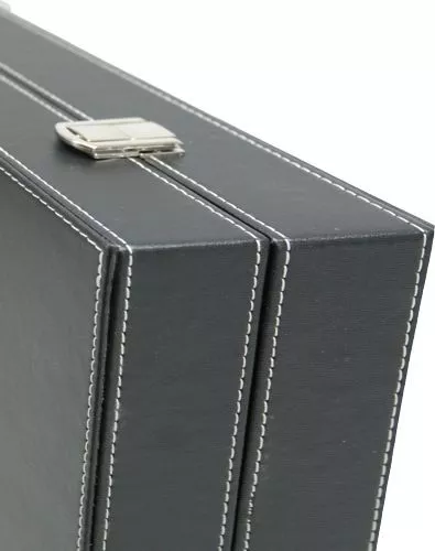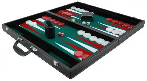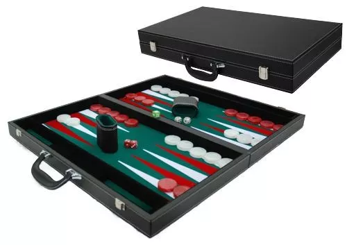 Backgammonkoffer 53 cm. XL de Luxe Casinomaat, luxe zwart kunstleder. Speelveld van groen velours, met ingelegde rode en witte punten diameter 38 mm. Met stenenvak, dikke rode en witte stenen parelmoer effect. Dobbelstenen met parelmoer effect en dobbelbekers. Afmeting dicht 53 x 32 x 8 cm. Open 53 x 64 x 4 cm.