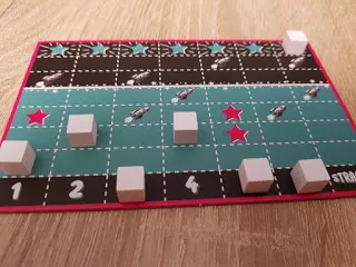 Vlot en eenvoudig te spelen dobbelspel, waarbij je op zoek gaat naar handige dobbelcombinaties waardoor je je blokjes omhoog mag verplaatsen.