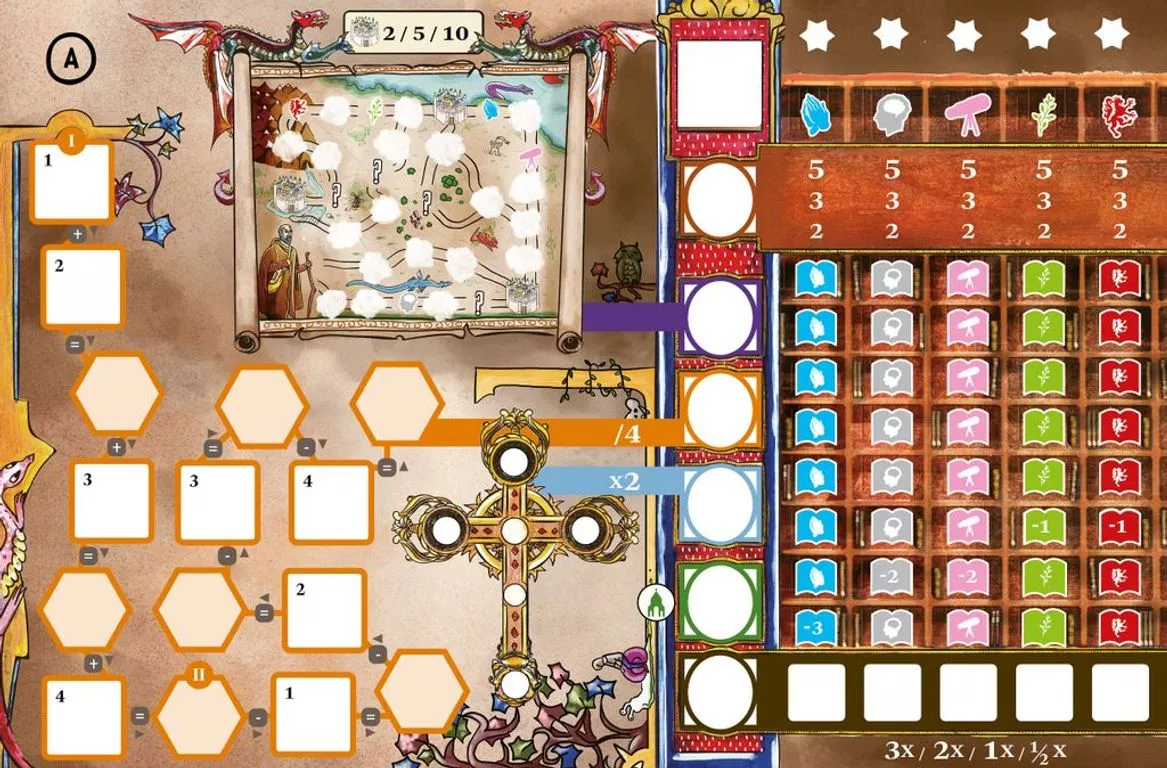 A “roll and write” version of the popular Biblios. The life of a monastic scribe is not easy. Every day you spend long hours in the monastery copying books, praying, and performing tasks. Through hard work and prayer, earn the abbot’s trust and display your dedication to the pious life.