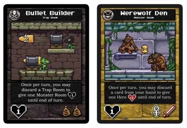 As before, players will build up their dungeon (with graphics inspired by classic videogames) in order to lure in heroes and defeat them before they reach your boss. New mechanisms such as the all new miniboss room cards will power up your dungeon in insidious new ways, and wreak havoc on your opponents’ dungeons.