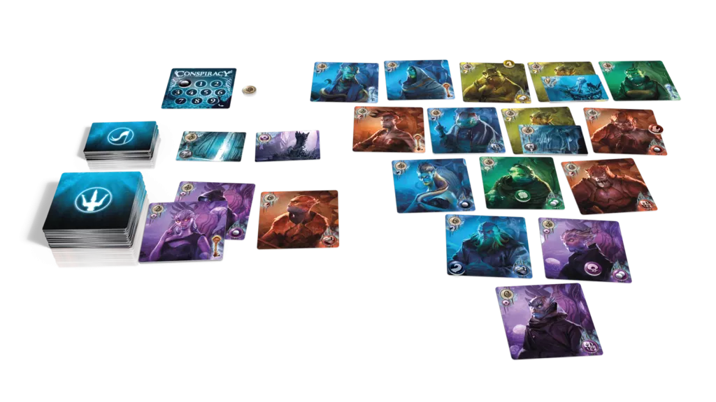 Conspiracy: Abyss Universe is een standalone kaartspel dat zich afspeelt in het Abyss universum. In de onmetelijke diepten van het koninkrijk Abyss zijn intriges en corruptie dagelijkse kost. De Oceanische Senaat staat aan het hoofd van een krachtmeting waarin jullie weergaloze plannen tegen elkaar smeden, in de hoop invloed te vergaren. Jij wil jouw Senaatskamer uitbouwen door de machtigste Lords te verenigen voordat je tegenstanders ze kunnen beïnvloeden. Zal jij erin slagen om je alleenheerschappij over de Senaat door te drukken? Dit spel bevat eenvoudige spelregels die binnen 5 minuten geleerd kunnen worden en biedt jou veel opties om samen te zweren tegen jouw tegenstanders! Beschikbaar in 5 verschillend gekleurde blikken, een voor elke Lord, die gelijk zijn qua inhoud. Inhoud: 60 Lord-kaarten, 24 Locatiekaarten, 20 Wapenschildfiches, 1 kaart van het Parelspoor, 1 markeersteen van het Parelspoor, 1 pion van de Parelmeester en 1 spelhandleiding.