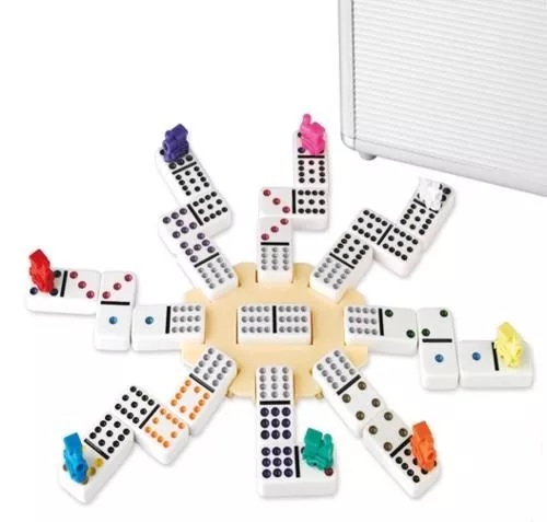 Domino Mexican Train met 91 stenen. Dubbel 12 domino verpakt in aluminium koffer met handvat. Compleet met 8 treintjes en station. Steenmaat is 50 mm x 25mm x 9.5 mm met gekleurde punten. Afmeting koffer 20.5 x 20.5 x 9 Cm Het meest gespeelde familiespel in Canada. Spelregels in Nederlands / Engels / Frans / Duits.