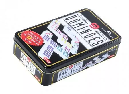 Domino spel in gekleurd blik met deksel. Afmetingen 50 x 25 x 10mm. Stenen van urea kunststof met gekleurde ogen. Inclusief spelregels.