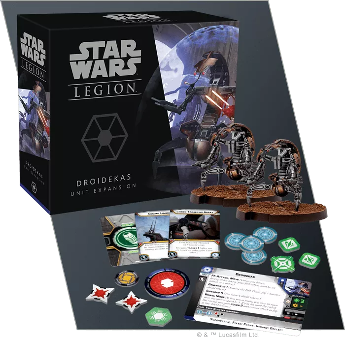The Droidekas Unit Expansion lets you support your droid forces with some of the most powerful combat droids in the galaxy. Four finely detailed, unpainted Droideka miniatures identical to those found in the Star Wars: Legion Clone Wars Core Set represent your Droidekas as they speed across the battlefield in wheel mode and unleash suppressive fire in their attack configuration. Meanwhile, a unit card fully outlines the Droidekas abilities while three upgrade cards give you the freedom to modify them with comms systems.