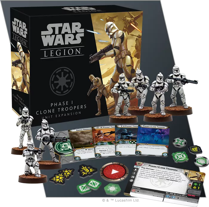The Phase I Clone Troopers Unit Expansion contains a full unit of seven unique, unpainted Phase I Clone miniatures, identical to the Phase I Clone Troopers included in the Star Wars: Legion Clone Wars Core Set. Five Phase I Clone Troopers wielding DC-15A Blaster Rifles are joined by a Z-6 Phase I Trooper and a DC-15 Phase I Trooper. This expansion also includes a unit card and an assortment of upgrade cards, inviting you to customize your Clone Troopers’ gear to fit your battle plan.