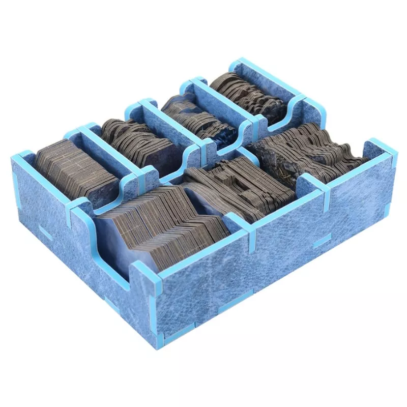 The insert trays are arranged as shown below. The rule and scenario books are stored vertically at one end of the box, next to the stacked character and miniature tuck boxes which the players are not currently using. We recommend using FS-FROST together with our optional FS-FHMAP map tile folder. When using all four player trays there is not sufficient space in the box to store the map tiles in the game box so these can be stored and organized by type in the FS-FHMAP folder. Alternatively you can remove the four player trays (storing your player pieces in the tuck boxes) and replace them with the map tiles, allowing storage of the entire game in the base game box with no lid lift.All card trays have space for sleeved cards. The insert comes with four optional player trays, which can be used if the game’s map tiles are stored elsewhere. Each tray has space for sleeved cards, slots for tokens, and a dip in the top for the player board and sheet. This tray from the top of the box stores the largest monsters, but also has space for up to four of the miniature tuck boxes. If four boxes are added there is room for just one to be of the larger type. The card dividers that come with the game are slightly too large for the FS-FROST insert mini card trays. Therefore we have provided with every copy of the insert eight new card dividers sized to fit the trays. When packing away the game, note that the rule and scenario books are stacked vertically at one end of the box. Then place the remaining A4 sized sheets on top of the trays. Add the remaining four player tuck boxes, dials, puzzle book and element board as shown. Lastly place the five scenario flowcharts on top of everything.