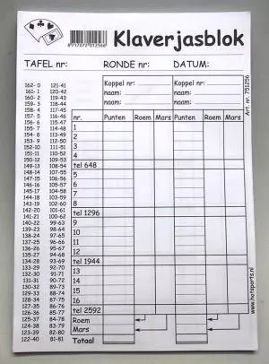 Klaverjas score bloc, Nederlands. 100 vellen per bloc. Afmetingen 21 x 15 cm, A5.