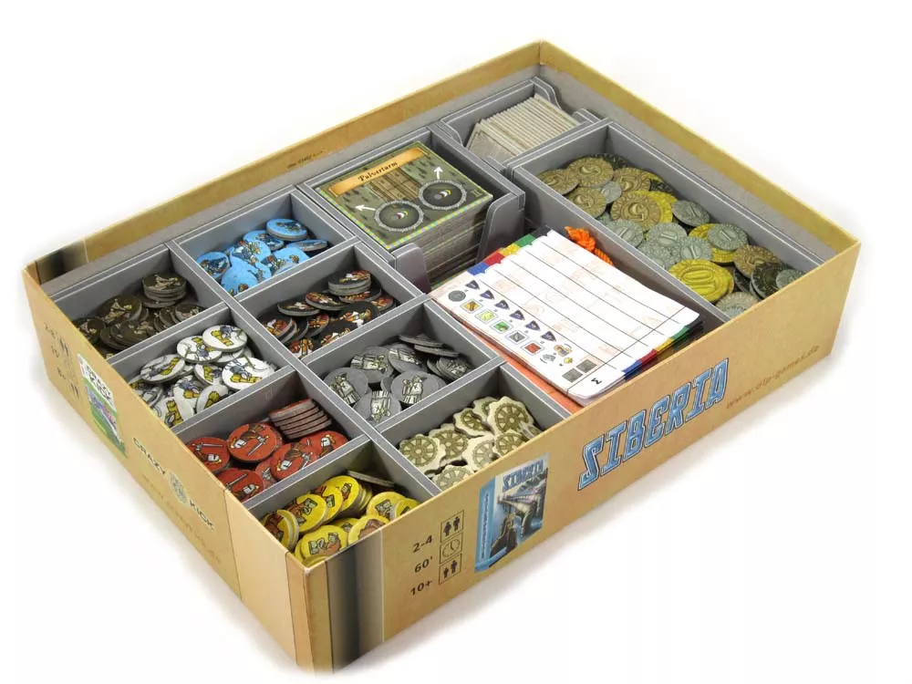 This insert is designed to be compatible with Orleans©, and includes space for the 5th player expansion. The design provides both efficient storage and improved game play. Many of the trays can be utilised during the game, and they greatly aid set-up and clear-away times. The boards and player boards act as a lid on top of the trays. There is a space in between the trays for storage of the folded player bags and score pad. Please Note – This product is intended for versions with a box size of 7.4 x 32.7 x 22.9 cm. It does not currently fit the smaller box size of the TMG version of this game. Nor is it compatible with the Deluxe version of the game. Insert features: One player pieces tray One character tiles tray One building tiles tray One event tiles tray Two trays for coins and trading station tiles This product consists of a flat-pack of 4 Evacore sheets. The trays require assembly, which is quick and fun, using ordinary PVA glue. Detailed instructions are included in the package.