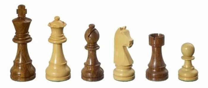 Set schaakstukken ‘Arcadius’ in buidel. Sheesham en Beuk, verzwaard, met viltsokkel, 900 gr. Koningshoogte 95 mm.