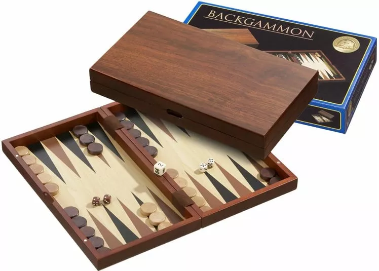 Medium backgammon kassette, mahoni gebijtst, magneetsluiting, compleet met speelstenen, dobbelstenen. 345 x 200 x 55 mm.