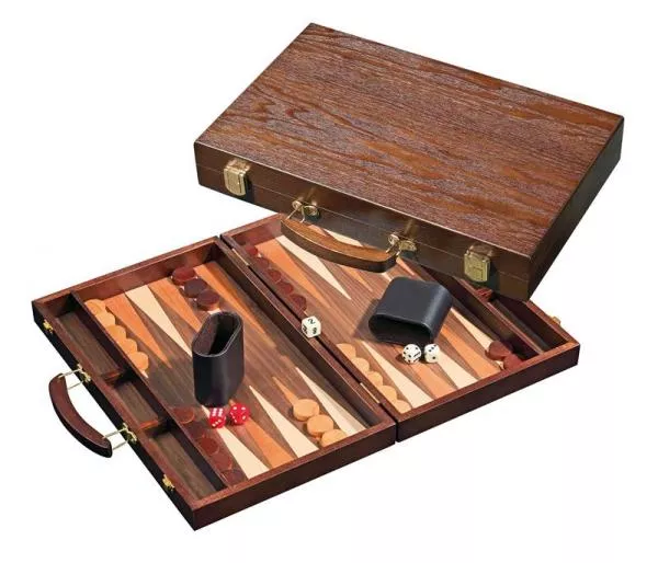 Medium backgammon kassette, walnoten-hout, compleet met speelstenen, dobbelstenen en beker. 380 x 240 x 55 mm.