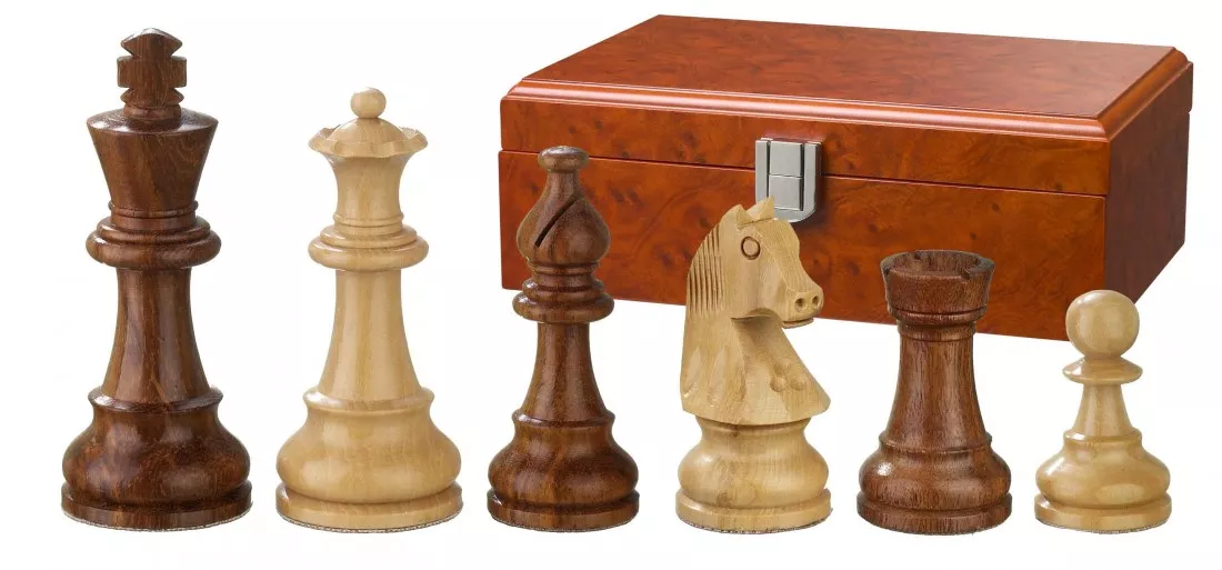 Houten box met set schaakstukken ‘Sigismund’, Sheesham en Beuk, verzwaard, met kunstlederen sokkel, Staunton. Koningshoogte 95 mm. Wordt geleverd met de afgebeelde houten kist.