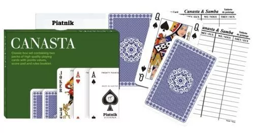 Canasta kaarten set Piatnik. Inclusief 2 decks Canastakaarten van hoge kwaliteit. Op de speelkaarten staat de punten waarde. Met scoreblok en spelregels.