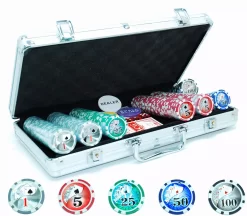 Pokerfiches koffer Aluminium gevuld Compleet met 300 laserpokerfiches professioneel, tweekleurig van 11 gram 40 mm.. Twee decks poker-speelkaarten en 5 dobbelstenen. Afmeting 40 x 20 x 6 cm. Waardes: 100 x 1, 100 x 5, 50 x 25, 25 x 50, 25 x 100.