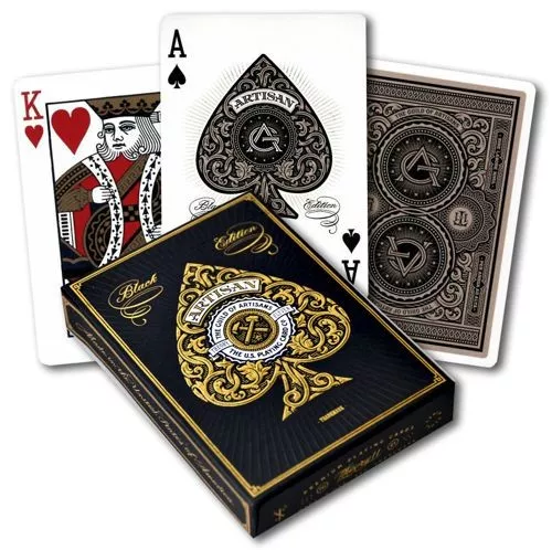 Pokerkaarten Artisan Black Premium Bicycle. Afmeting 88 x 63 mm, internationale pop. Afgedrukt op premium papier met een hoogwaardige afwerking. Standaard 2 index. Bicycle USA