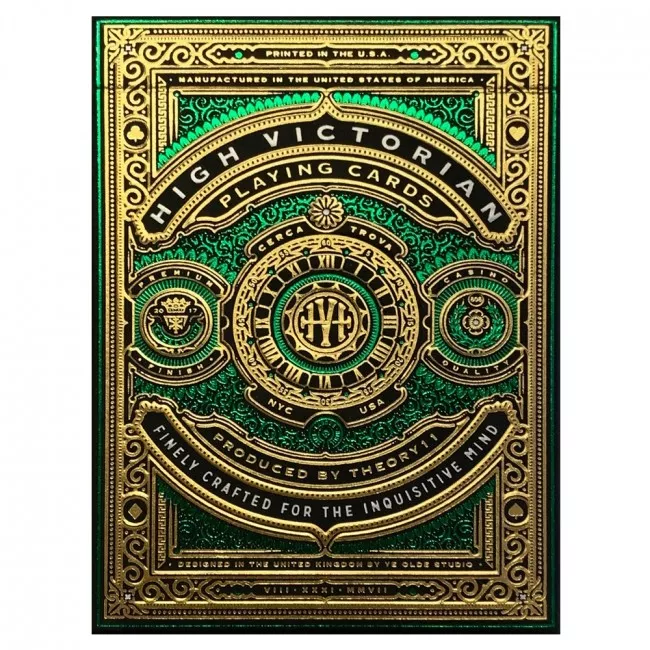Pokerkaarten High Victorian Groen Theory11 Gedrukt op Premium Bicycle papier. Afmeting 88 x 63 mm, internationale pop. Afgedrukt op premium papier met een hoogwaardige afwerking. Standaard 2 index.