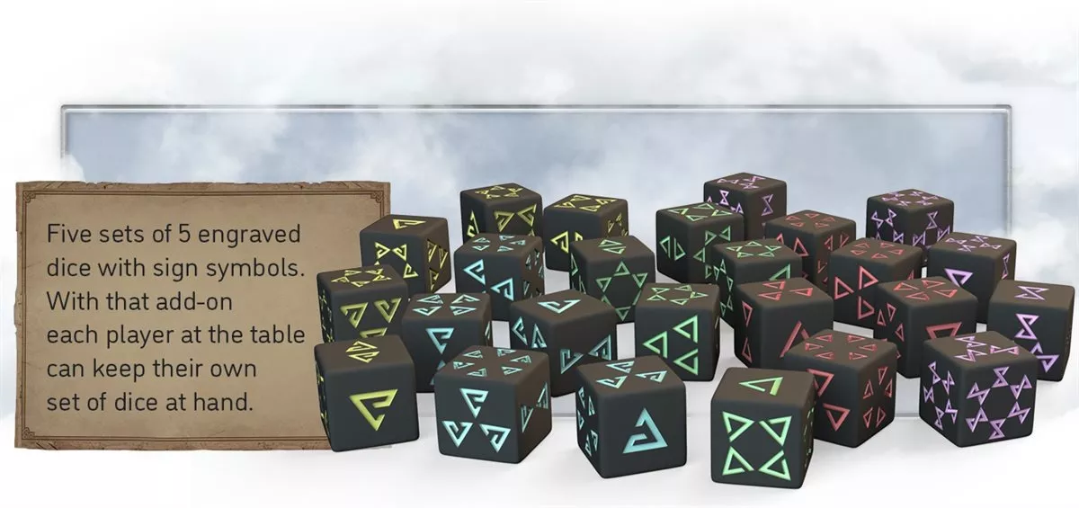 It contains 5 sets of dice, so each player can have their own set. Every set contains 5 dice with a witcher sign engravement and a different color. Those are used for dice poker and some Exploration Cards.