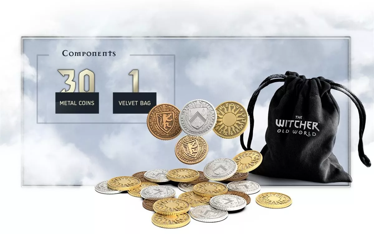 This product contains 30 metal coins in a special bag. Coins are in 3 different designs to represent variable currencies on the Continent, but each is worth 1