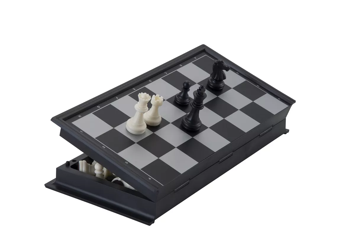 Reis schaak magnetisch opklapbaar 25 x 25 cm. zwart wit, koning hoogte 50 mm.in doosje. Inclusief opberg compartiment.