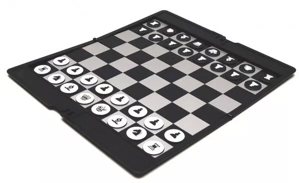 Deze reisschaak set is 10 x17 cm groot, de stukken zijn plat en magnetisch. Hij past in iedere binnen zak of rugtas.