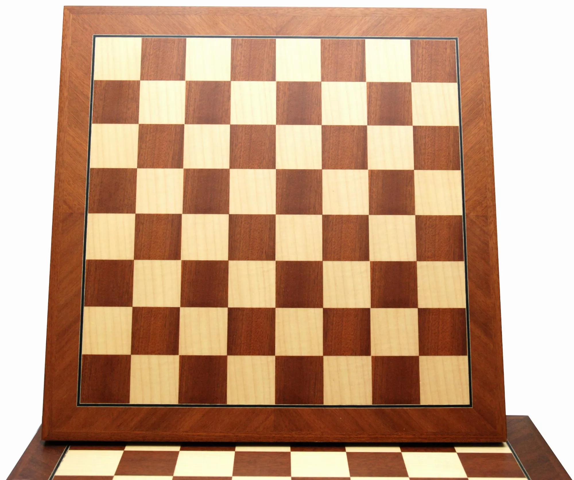 Schaakbord Mahonie/Ahorn-hout. Geheel ingelegd hout, Mahonie/Ahorn-hout. Rand diagonaal ingelegd. Gefabriceerd in Spanje.