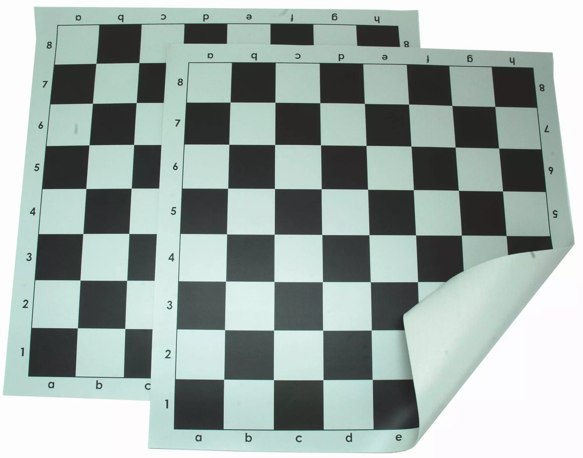 Schaakbord vinyl en oprolbaar. Zwart / Wit. 51.5 cm met Cijfers en Letters. Veldmaat 55 mm. Aanbevolen schaakstukken Staunton 6.