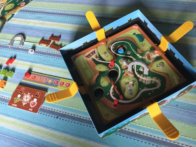 De slechteriken hebben de controle over ons prachtige koninkrijk overgenomen in Slide Quest en het is een puinhoop! Je moet de wereld redden, en snel! Laat ons samen deze dappere, rollende ridder leiden door dit turbulente avontuur, bezaaid met valkuilen en wendingen… Slide Quest is een fantastisch bordspel waarbij je probeert om de ridder te helpen om het einde van elke kaart te bereiken en daarbij valstrikken en obstakels te vermijden. Gebruik de hendels (die je aan de doos vastmaakt) om de ridder te laten schuiven, maar let op: er zijn diverse hindernissen, bewakers en een schurk die jouw weg moeilijk maken en jouw levensteller laten dalen… Er zijn in totaal 20 kaarten (4 verschillende werelden met elk 5 kaarten) die je kunt spelen: om het spel te winnen probeer je de ridder veilig en succesvol door een wereld van 5 kaarten (bij een kleine queeste) of de volledige 20 kaarten (grote queeste) te loodsen en het koninkrijk te redden. De moeilijkheidsgraad wordt hoger naarmate je van de ene naar de andere wereld gaat. Als je levensteller echter op nul komt, dan verlies je het spel. Inhoud: 1 spelbord met vallen, 4 hendels, 20 landschapskaarten, 1 rollende ridder, 8 obstakels, 9 vallen, 1 levensteller, 1 ‘hart’-steen, 1 Spelbewaarder en een spelhandleiding.