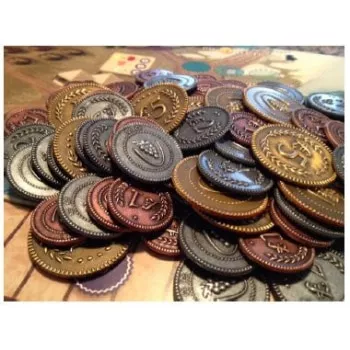 These 80 custom metal coins are designed specifically for Viticulture and Tuscany by artist Beth Sobel. They include denominations of $1, $2, and $5. They’re made of zinc.