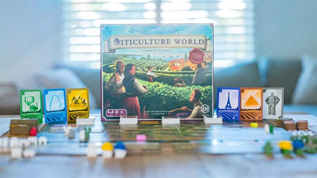 Using the new game board, tiles, tokens, and event cards combined with the original vineyard mats and game cards, you have 6 years to achieve the two conditions necessary for victory in the selected region: (1) Each player must reach 25 victory points and (2) the shared influence token must reach the end of the influence track.
