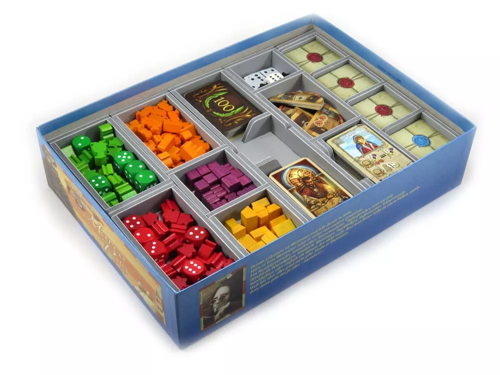 Note: Insert designed for game with external box dimensions of 31.8 x 22.9 x 7.1 cm. Note also that this is the revised version of our original FS-MPO insert. Insert compatible with The Voyages of Marco Polo® including the The New Characters® mini expansion and The Agents of Venice® expansion. The design provides both efficient storage and improved game play. Many of the trays can be utilised during the game, and they greatly aid set-up and clear-away times.