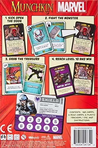 Munchkin Marvel fuses the classic card game fun of monster-slaying and role-playing with the most iconic characters from the Marvel universe. Created under license from Steve Jackson Games and in conjunction with Marvel, Munchkin Marvel comes complete with new monsters (villains), allies (heroes), and custom S.H.I.E.L.D. Identification Cards.