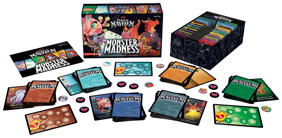 In Dungeon Mayhem: Monster Madness, you play as one of six epic D&D monsters, each with their own way to charm, crush, disintegrate, and devour their foes. Pit these cunning creatures against any other Dungeon Mayhem deck, and store all your cards in this monster-sized box. Then select your favorite and prepare for mayhem. Plus, you can also enjoy bringing more adventurers into the fold with the addition of rules to include up to 6 players!